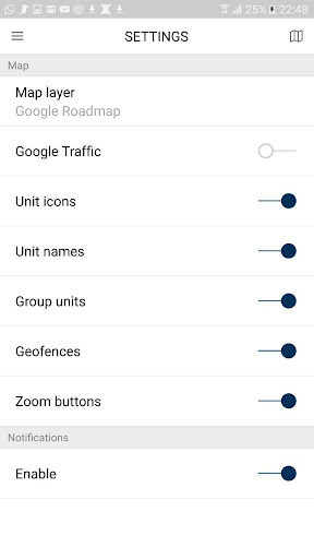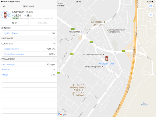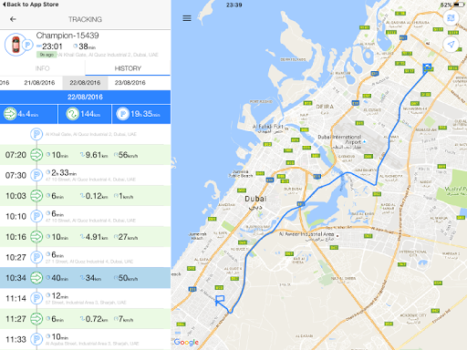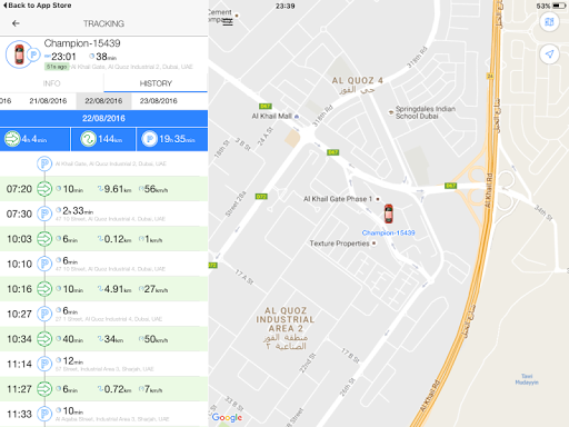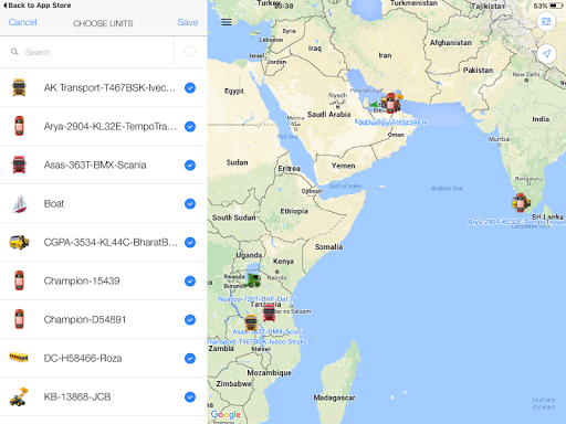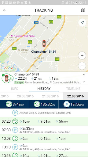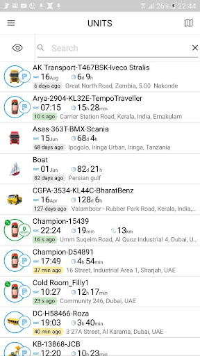 The map view (TRACKING) shows all your vehicles with real time movement. Your position is also shown which makes it easy for you to relate with the locations of your vehicles. This also helps you to reach your vehicle easily.