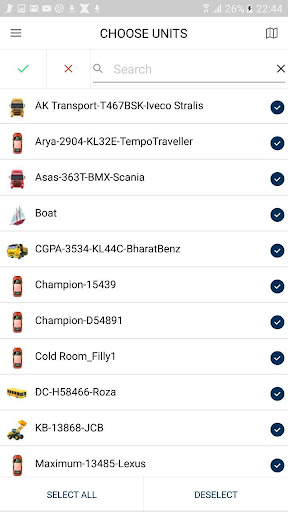 The UNITS menu item is used to select the vehicles you need to monitor. The screen will be zoomed and centered in such a way that the vehicles you selected will always appear in the center.