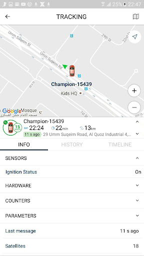 The details of vehicle movement is shown in the HISTORY tab which can be expanded by swiping the screen up in the same view. Trip details such as when and where the vehicle was started, the distance traveled, when the vehicle was stopped, how much time it was parked etc are all shown in the expanded view. A click on any of the trips will draw the route travelled by the vehicle during that trip on the map with start and finish flags. Amazing! Isn’t it?