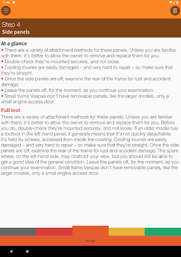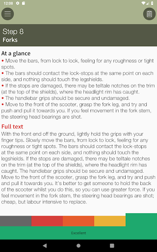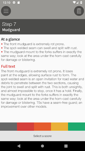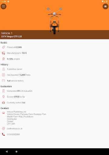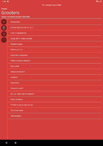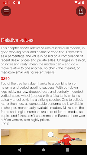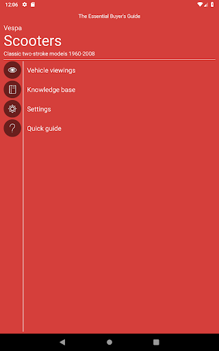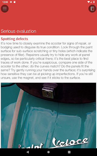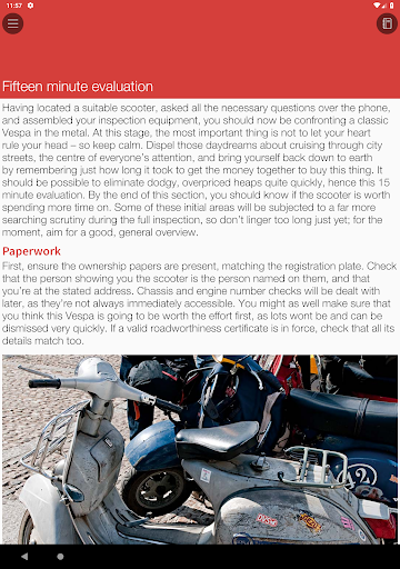 The app includes illustrated expert advice on all aspects of buying a Vespa. Included is an interactive Evaluation section, so you can assess the true quality of a potential purchase, and make sure you don’t forget to check any of the important areas.