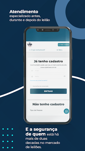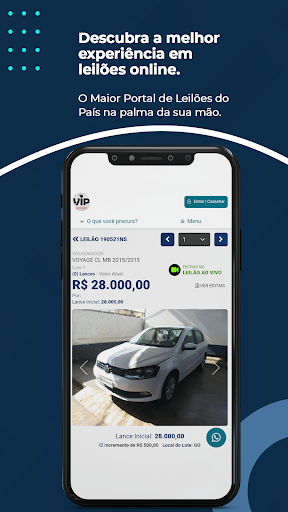 Aproveite todas as vantagens da Vip Leilões na palma da sua mão, com segurança e tecnologia.