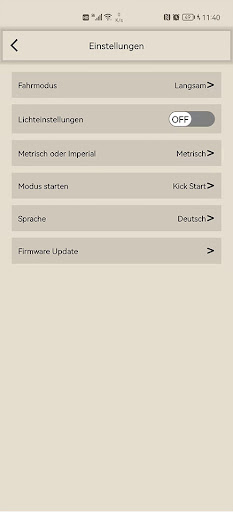Fahrmodus ECO/SPORT, Scheinwerfer (Licht An/Aus), Aktuelle Einheit (Metrisch/Imperial), Modus starten (Kick-Start/Zero-Start), Aktuelle Sprache (wählbar; Deutsch, Englisch, Französisch, Italienisch, Spanisch, Russisch, Japanisch, Chinesisch), Passwort Einstellungen, Feedback an VMAX, Erweiterte Einstellungen, Firmware Upgrade.