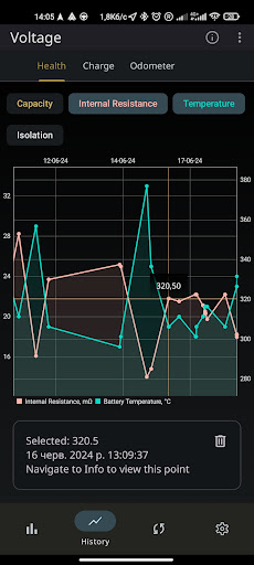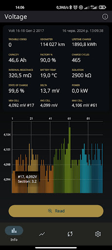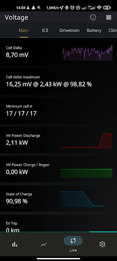 – Reading of current battery state: SoC displayed, Capacity, HV Isolation, Temperature, Internal Resistance, Cells 1-96 voltage, Min, Max, Avg, Disbalance (Delta), and many more