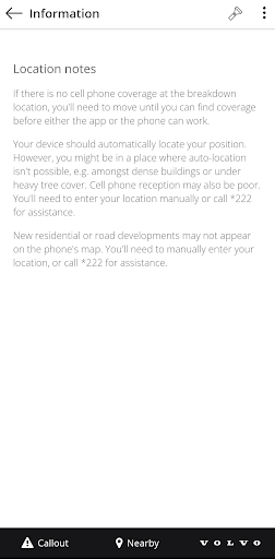 To use the Volvo Roadside Assistance app you need to be in New Zealand and registered for the Volvo Roadside Assistance Program.