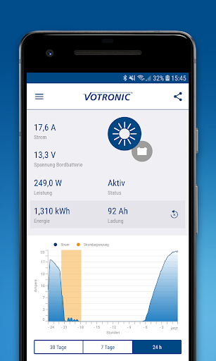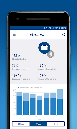 Der Energy Monitor liefert in Verbindung mit dem Votronic Bluetooth Connector S-BC alle Live-Daten des Votronic Solar-Ladereglers (ab 2013) und/oder des LCD-Batterie Computer S bzw. VPC Jupiter mit Smart Shunt.