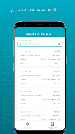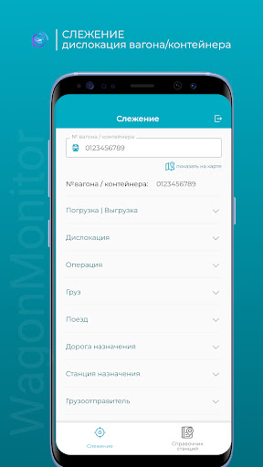 Приложение для клиентов Ж/Д транспорта, информирует пользователей о дислокации, техническом состоянии вагонов и контейнеров, а также об операциях с ними в процессе перевозки. Сервис определяет дислокацию вагонов и контейнеров на протяжении всех этапов перевозки. Позволяет отслеживать местонахождение, последние операции с вагоном и контейнером, состояние вагонов, оперативную оценку времени прибытия груза.