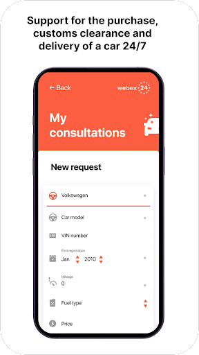 Buying and paperwork for transport anywhere in the world will be easy with webex24. Complete information about your deals literally “in your pocket”. Suitable for brokers, car traders and car dealerships, car houses and drivers who deliver vehicles from anywhere in the world and by any transport. Request vehicle purchase deal, clarify any details during the process using chat with your manager and get notified about the process in real time. Send and receive needed documents using the app, obtain preliminary evaluation on the go and review accumulated cost breakdown directly in your request.