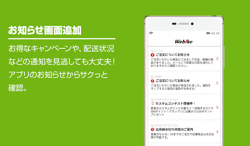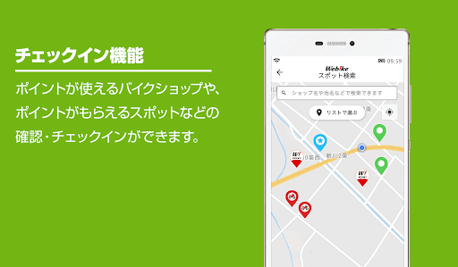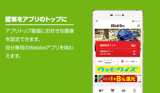 ・Webikeアプリをインストールすると、WebikeパートナーバイクショップでWebikeポイントがご利用いただけるようになります。