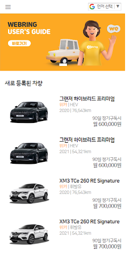 Webring is a platform that provides used car subscription and rental services for foreigners living or traveling in Korea. We resolve realistic barriers experienced by foreigners, such as financial service restrictions, complex document preparation and screening, and lack of language services, and provide simple non-face-to-face services through an app.