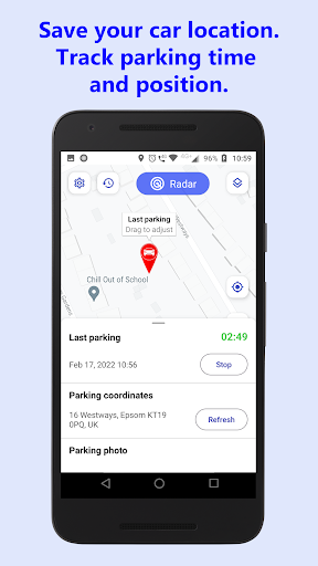 • Another great view for the car parking is Radar view. It works even without Internet connection. It is best to find your car on parking. Radar clearly shows direction and distance to your car. It uses GPS, accelerometer and magnetometer of your phone to calculate the location where car is and direction for you to go.