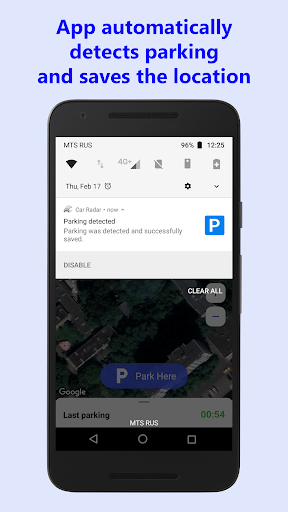 • App saves car parking location automatically based on activity recognition algorithm provided by the Android OS. It detects the exact location, saves parking start time. Optionally it may notify you that parking was started but mainly it does everything automatically. Sometimes false positives may occur especially when you are underground. Also detection algorithm does not know if you are in your car or on public transport now. If false positives annoy you then it is always possible to completely switch off this feature in Settings. Or you may switch off just notifications.