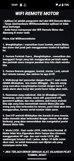 – Cara kerja alat ini adalah dengan menggunakan Aplikasi berbasis android yang dihubungkan ke alat yang dipasang di motor anda melalui koneksi Hotspot Hp anda . dengan memejet tombol di Aplikasi dari HP anda maka anda bisa menghidupkan kontak, mesin, dan mengamankan motor saat diparkiran.