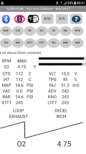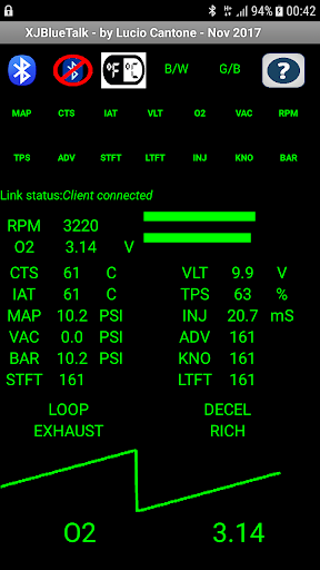 Monitored sensors are: MAP, CTS, IAT, VLT, O2, VAC, RPM, TPS, SparkADV, Loop Mode, Exhaust, InjPulse, Knock, Baro, STFT and LTFT.