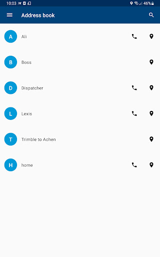 This allows the driver to visualize the list of contacts assigned to them in fleetworks. If the contact has a valid address, the driver will be able to use it for navigation. If the contact also has a valid phone number, the driver can use it to call the contact person.