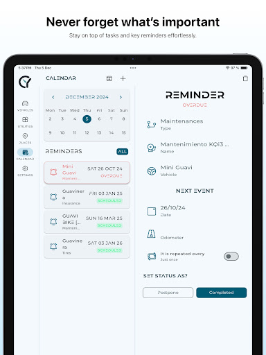 Effortlessly track, optimize, and maintain your vehicle with our app. Manage reminders, track fuel consumption, and schedule maintenance for peak vehicle performance.