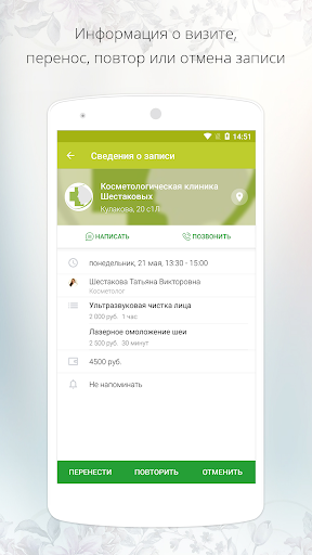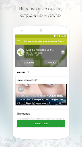 Приложение позволяет вам управлять своими записями, просматривать предыдущие визиты, следить за акциями и скидками, получать напоминания и отправлять сообщения сотрудникам для уточнения деталей.
