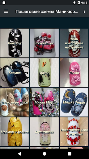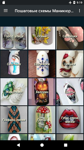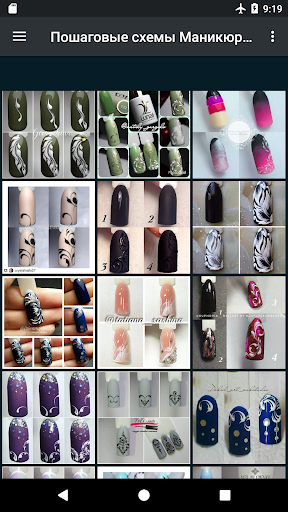В приложении представлены картинки, с идеями маникюра – пошаговый, поэтапный маникюр. Идеи отсортированы по тематикам согласно стилям и видам маникюра.