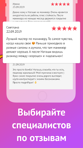 Наши ключевые преимущества – возможность онлайн записи на услуги к более 300 тыс. мастерам красоты на прямую, без телефонных звонков.