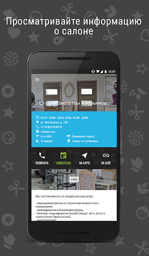 • Просматривать информацию о салоне – режим работы, адрес и телефон, фото интерьера