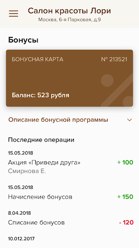 – Личный кабинет с историей всех предыдущих и будущих визитов, а также любимых услуг