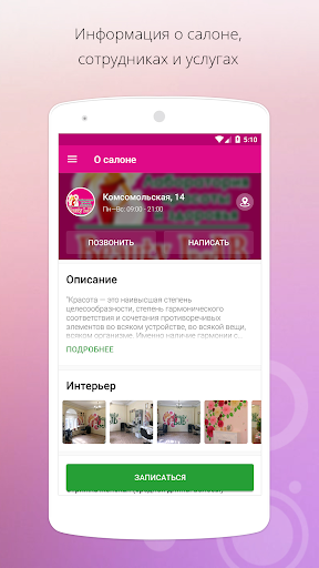 – ознакомиться с детальной информацией о нашем салоне (адрес с указанием маршрута на карте, график работы, контакты, перечень услуг с указанием стоимости и длительности, фото интерьера, примеры работ мастеров, отзывы);