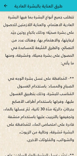 العناية اليومية للبشرة العادية تتميز بتوازنها واعتدالها بمقدار الزيوت التي تحتويها فلا تُعدّ دُهنيّة، ولا جافّة كما تتميّز بقلّة عيوبها وعدم وجود الحساسيّة عليها بالإضافة إلى مسامها الطبيعيّة وغير الواسعة ومظهرها المُشرق وهناك العديد من الطرق التي يجب اتباعها للمحافظة على هذا النوع من البشرة طرق العناية بالبشرة العادية وصفات طبيعية بالبشرة العادية منها خثارة اللبن والبيض و نشا الذرة وبياض البيض والتفاح والكريمة ودقيق الشوفان والعسل وزيت الزيتون