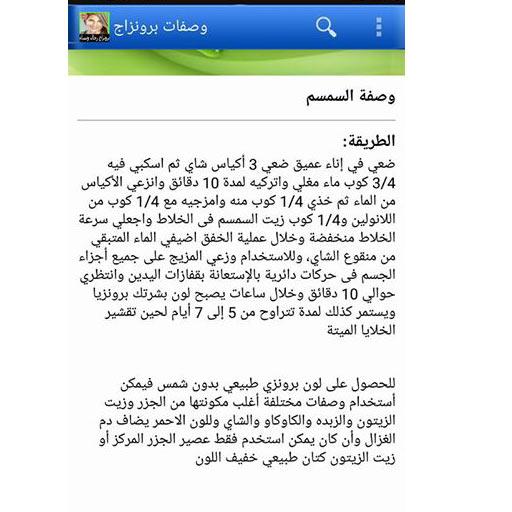 أما عن وصفات للتسمير والخلطات طبيعية للحصول على لون برونزي طبيعي بدون شمس فهي كثيرة في اطبيقنا هذا