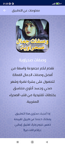 مجموعة واسعة من الوصفات: يقدم التطبيق مجموعة كبيرة ومتنوعة من الوصفات الصحراوية لتجميل الوجه والجسم والشعر، بما في ذلك وصفات للعناية بالبشرة والأظافر وتطويل وتقوية الشعر وتفتيح البشرة والمناطق الحساسة وغيرها الكثير من الخلطات المجربة ذات فعالية كبيرة، مما يضمن توفير العديد من الخيارات وإيجاد كل ما يخص جمالك سيدتي.