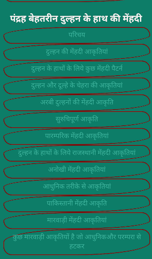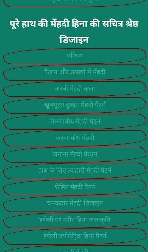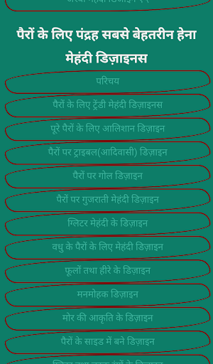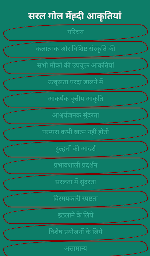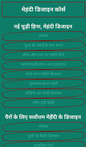 एप में आसान मेहंदी डिजाइन, मेहंदी टैटू, दुल्हन मेहंदी डिजाइन, ईद मेहंदी, करवाचौथ, रक्षा बंधन मेहंदी डिजाइन, भारतीय मेहंदी डिजाइन, पाकिस्तानी मेहंदी डिजाइन, राजस्थानी मेहंदी डिजाइन, अरबी मेहंदी मेंहदी डिजाइन या अरबी मेंहदी डिजाइन, दुहलंदी मेहंदी डिजाइन शामिल हैं।