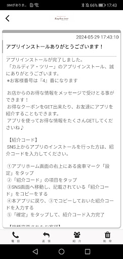カルディア・ツリーのアプリをSNSを通じてお友達に紹介する事ができます。