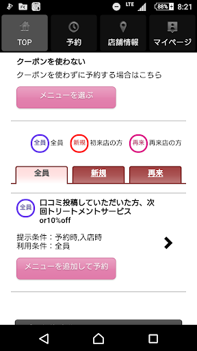 お得なクーポンが配信されます。ネット予約時にクーポン利用での予約も可能なので来店時もスムーズに施術頂けます。