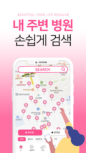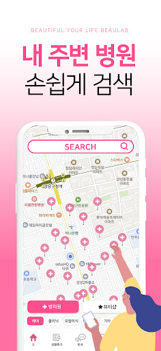 지도 검색 기능으로 나의 위치를 파악하여 최적화된 병원 정보를 제공하는 성형어플 뷰랩!