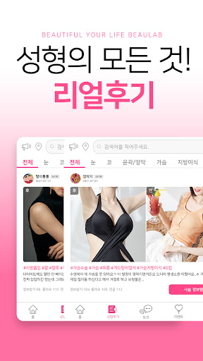 성형/뷰티 커뮤니티 공간에서 실제 경험담과 팁을 공유하고 다양한 정보를 실시간으로 이야기할 수 있어요.