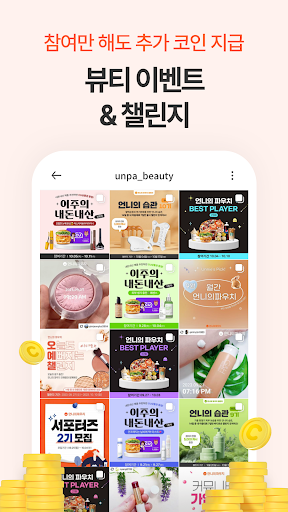 뷰티 리뷰 작성, 이벤트&챌린지, 친구 초대 등 날마다 쏟아지는 뷰티 코인!