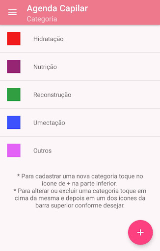 * Categorias pré cadastradas (ex. Hidratação, Nutrição, etc.) diferenciado por nome e cor. Pode-se cadastrar novas categorias também;