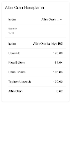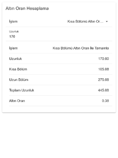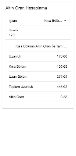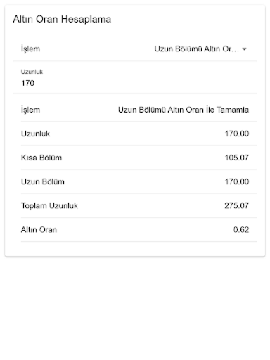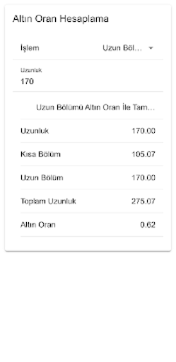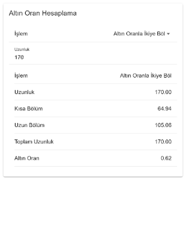 Bu uygulama ile ‘Altın Oranla İkiye Böl’, ‘Kısa Bölümü Altın Oran İle Tamamla’, ‘Uzun Bölümü Altın Oran İle Tamamla’ seçeneklerinden birini seçerek altın oran hesaplaması yapabilirsiniz.