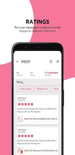 Nikmati kemudahan bertransaksi produk-produk Baby Pink Skincare dengan menggunakan aplikasi Baby Pink Skincare. Unduh aplikasi ini dan pastikan anda terdaftar sebagai user Aplikasi Baby Pink Skincare.