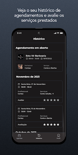 Através do App Barbearia Esto Vir os clientes podem realizar seus agendamentos de uma forma muito mais prática. Na tela inicial, é possível selecionar os serviços e horário desejado para seu próximo atendimento. Já na tela de histórico, você poderá confirmar ou cancelar seus agendamentos. É possível também na tela do perfil o cliente editar suas informações, como e-mail, foto de perfil e telefone.