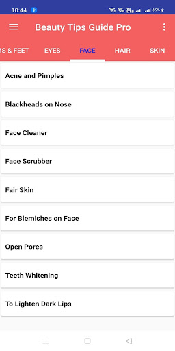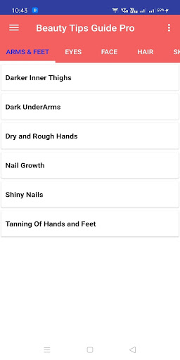 Homemade Beauty Tips App contains Natural beauty tips which can be easily prepaid at home. This app includes a number of Natural Ayurvedic remedies for Beauty related problems of Face, Hair, Eye, Skin, Arms and Feet. It is given as five categories