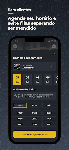 Já os barbeiros possuem um acesso independente da barbearia vinculada, tendo acesso a sua agenda de horários, histórico e relatório de comissão (caso a barbearia for premium).
