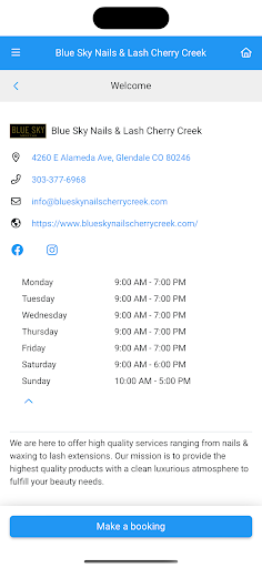 Blue Sky Nails & Lash, Cherry Creek community app. Receive specials on promotions, sign up for our loyalty program, manage and reserve bookings, view your upcoming appointments conveniently from one place.