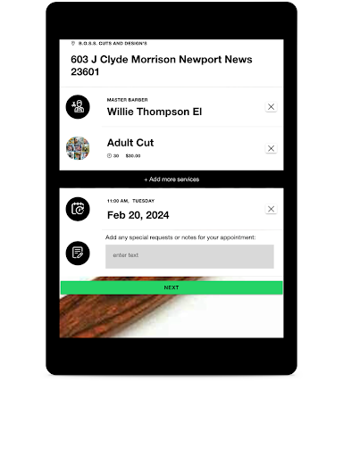 Welcome to Boss Cuts and Design’s, your go-to solution for hassle-free barber appointments! Discover a seamless booking experience that puts you in control. Explore a range of services, check prices and durations, and effortlessly navigate through the schedule. Find the perfect time slot that suits you, ensuring a personalized grooming experience tailored to your schedule.