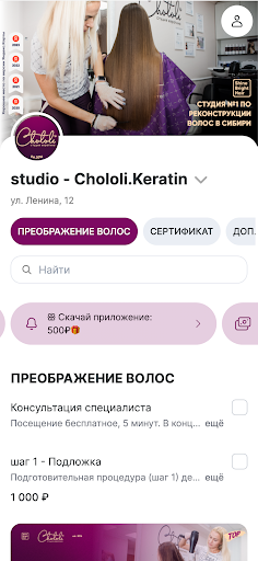 Мы представляем инновационное приложение, которое делает процесс записи в студию Chololi легким и приятным. Наслаждайтесь комфортом и стильным обслуживанием в любое удобное для вас время.