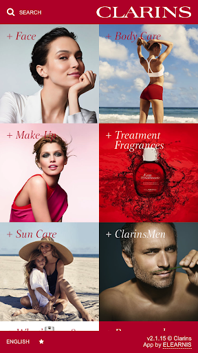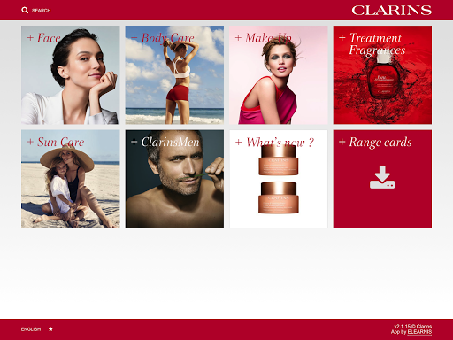 It is organized as a catalogue and displays all the categories of Clarins products: Face, Body, Sun, Treatment Waters, ClarinsMen and Make-Up.