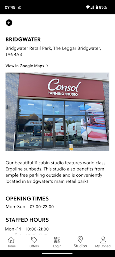 Find your nearest Consol studio simply by allowing the app to access your current location. It’ll find the studio closest to you and its opening times, busiest hours and sunbeds available in the studio.