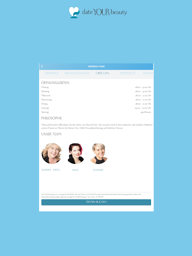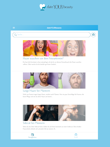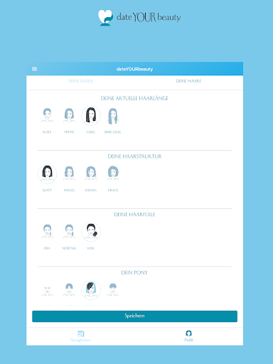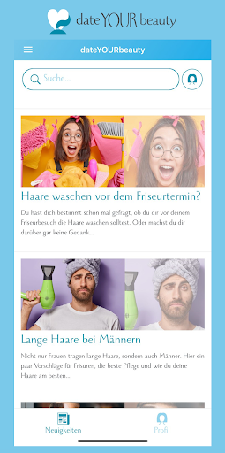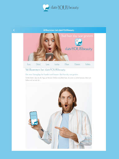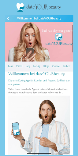 Deine Haare gibt es nur ein Mal auf der Welt. Die dateYOURbeauty App zeigt dir, was du brauchst, damit ein „bad hair day“ nie wieder vor kommt. Durch ein Haar-Quizz in wenigen Schritten teilst du der App alles Wichtige über deine Haare mit. In der App kannst du ein Haar-Profil erstellen, das dir mehrere Wege zu deiner Traumfrisur eröffnet. Wir zeigen dir die haarigen News; von Haarpflege und Stylingtips bis zu Farbtechniken oder Schnitte, die dir vielleicht stehen könnten, aber nur die News, die wirklich zu dir passen. DateYourBeauty erspart dir langes Suchen im Word Wide Web über deine Haarprobleme. Ein Team aus Haarprofis verfasst aktuelle Berichte, die sich genau mit den Themen befassen, die sie tagtäglich in ihren Friseursalon von Kunden hören. Keine grosse Werbung sondern Problemlösungen zeichnen die dateYOURbeauty App aus.