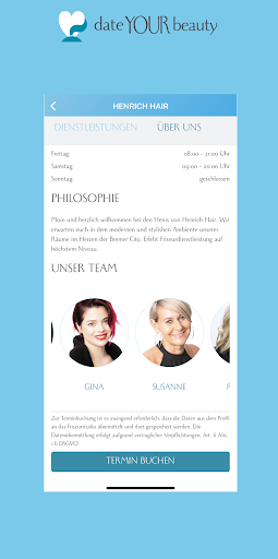 Im nächsten Schritt von dateYOURbeauty wird gedatet. Finde durch die Suchfunktion schnell und einfach einen Friseur in deiner Nähe. Aber nicht irgendeinen! Der Friseur wird dir ganz anders gezeigt, Persönlichkeit wird gross geschrieben. Lese über die Hobbys deines Friseurs, seine Vorlieben im Job bis hin zu seiner Lieblingsserie. So ist für das erste Date schon genug Gesprächsstoff da und du kannst dich einfach wohlfühlen.