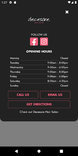 The Decesare Hair Salon booking app allows clients to log on and make bookings online under their own profile 24/7. Clients can track loyalty points as well as looking at historic and future bookings and get directions for their favourite salon.