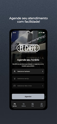 Através do App El Chefe os clientes podem realizar seus agendamentos de uma forma muito mais prática. Na tela inicial, é possível selecionar os serviços e horário desejado para seu próximo atendimento. Já na tela de histórico, você poderá confirmar ou cancelar seus agendamentos. É possível também na tela do perfil o cliente editar suas informações, como e-mail, foto de perfil e telefone.