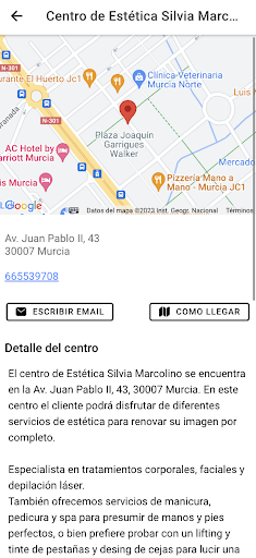 El centro de Estética Silvia Marcolino se encuentra en la Av. Juan Pablo II, 43, 30007 Murcia. En este centro el cliente podrá disfrutar de diferentes servicios de estética para renovar su imagen por completo.